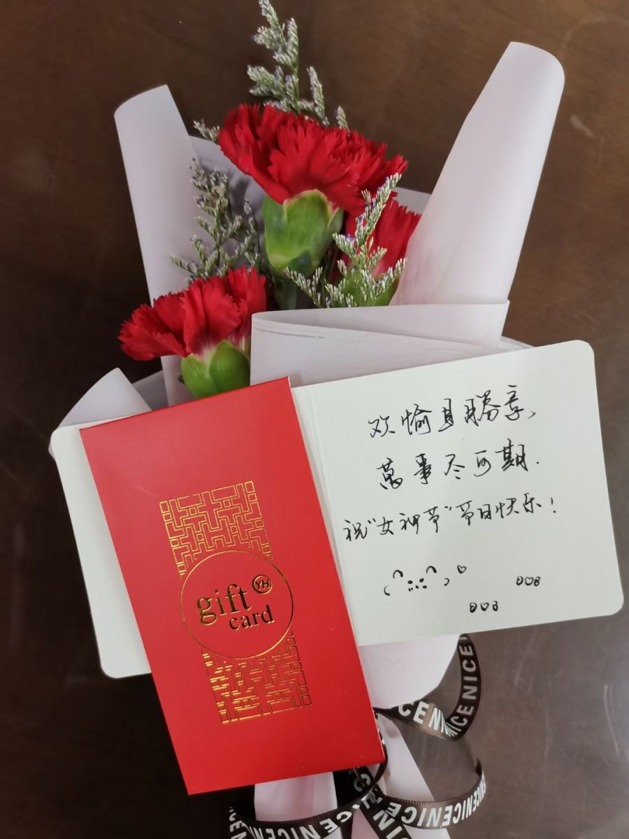 为体现公司的人文关怀,丰富公司女员工的精神生活和业余生活,公司工会携人力资源部共同举办本次“女职工双爱”活动。 康乃馨是所有女性的神圣之花,美好典雅的典范。 从前车马慢,书信远; 一张张贺卡,一笔一划,都是满满的爱意; 每一张卡片都是“私人订制” 女神节,怎能少的了,买买买。 公司工会为每一位女职工提供了惊喜购物卡。 女神节快乐!愿你出走半生 归来仍是少女。