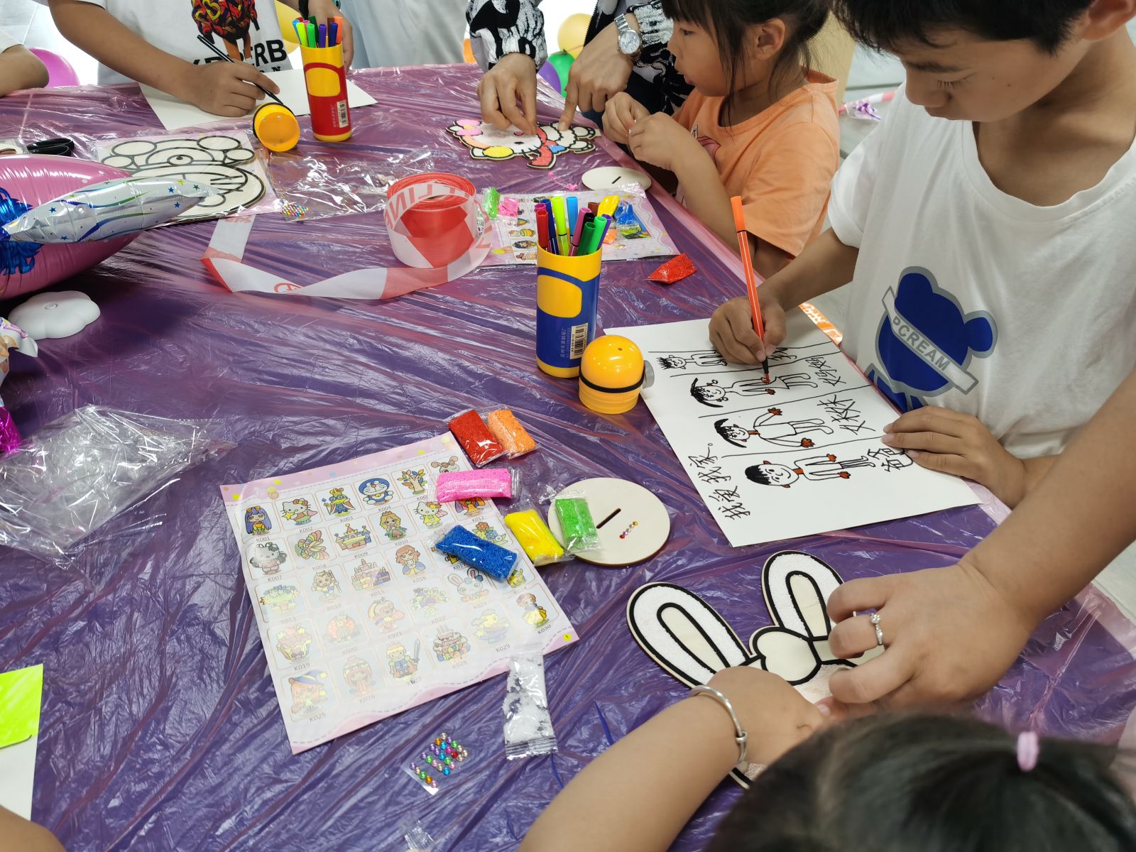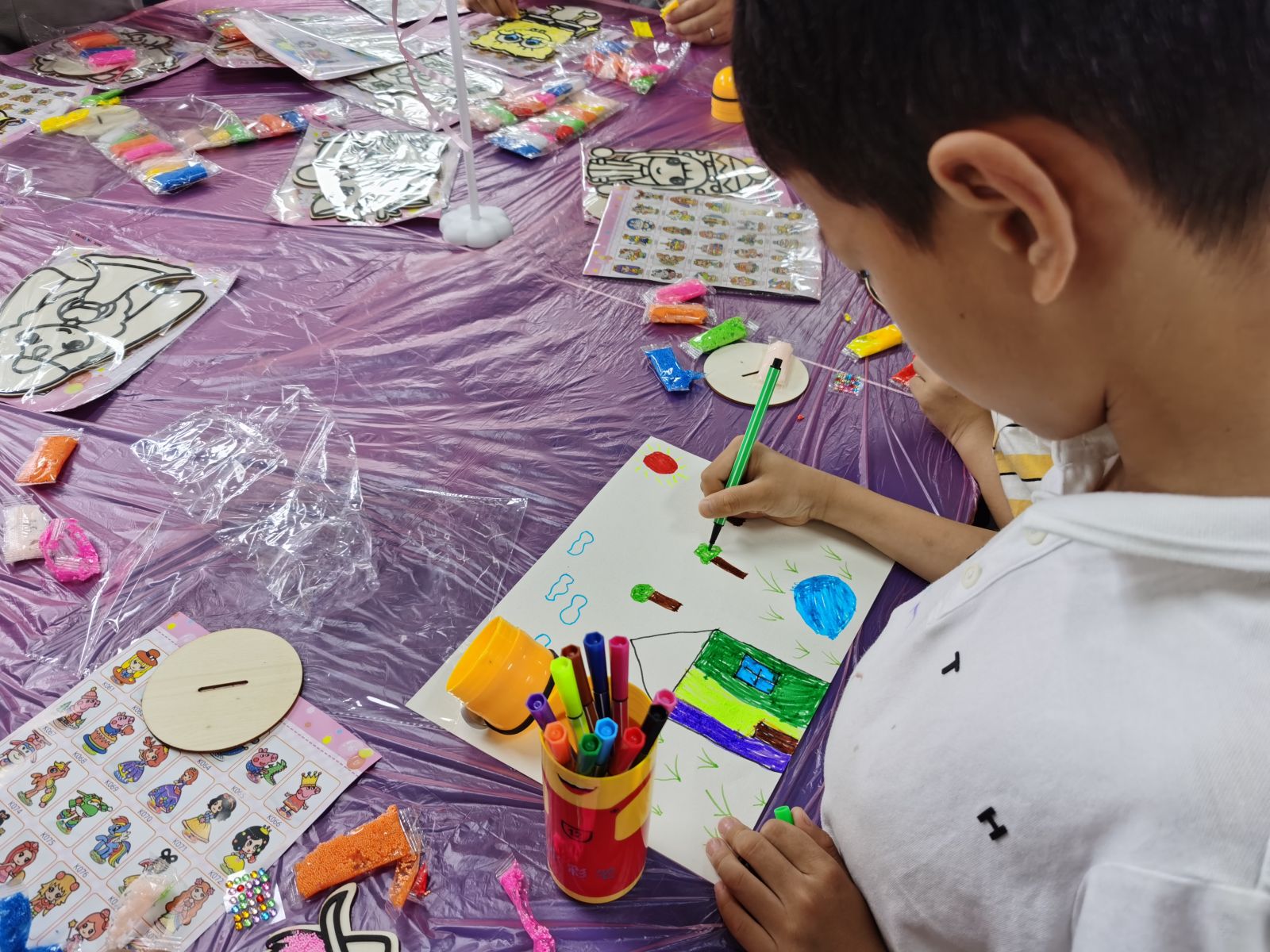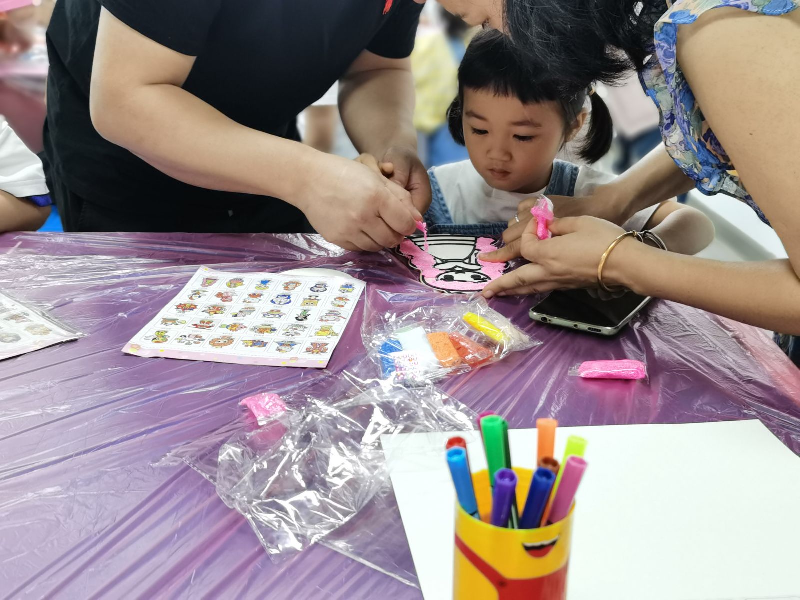 少儿绘画环节也已经开始了,工作人员根据宝宝们的年龄,贴心的进行了分组,3-6岁的小宝宝是以雪花泥作画哦。