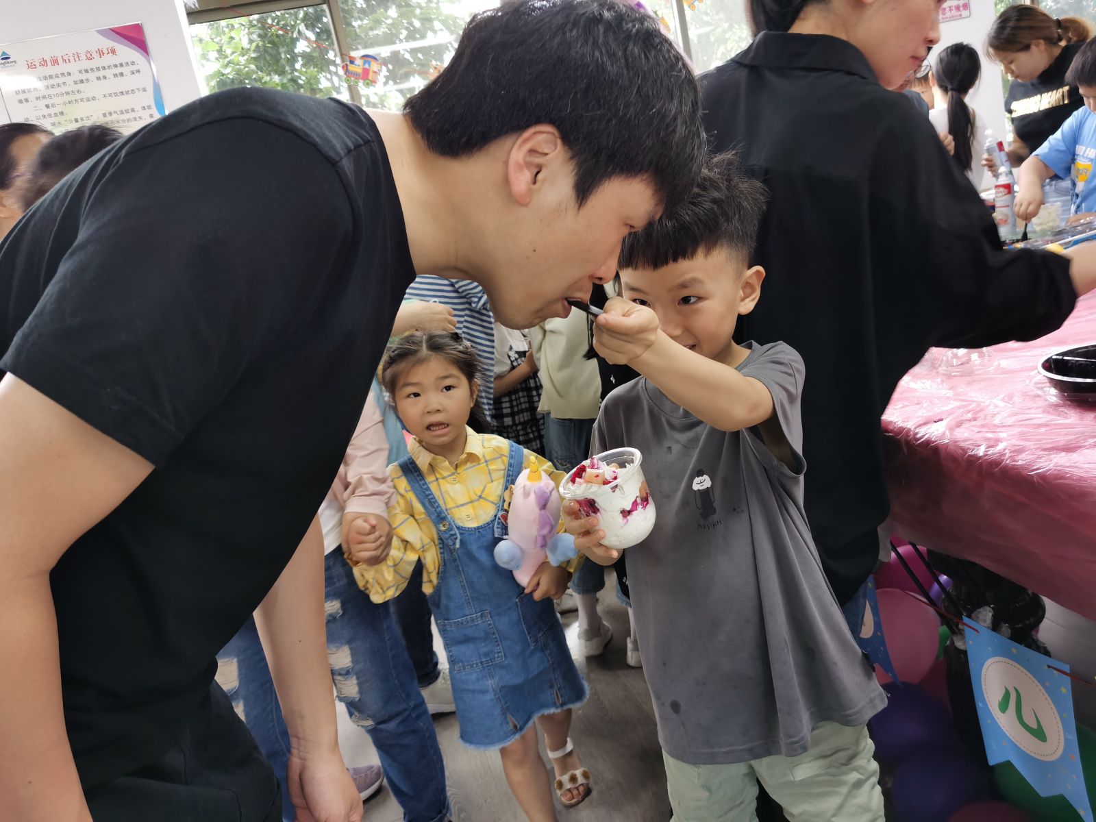 “哇,有奶油耶”。这边的宝宝们已经跃跃欲试了,在杯子里挤满了奶油,摆上了喜欢的水果,看宝宝们的动手能力有多强!拿着自己DIY的奶油水果杯,送给爸爸妈妈,你一口,我一口,嗯,今天的奶油水果杯特别甜。